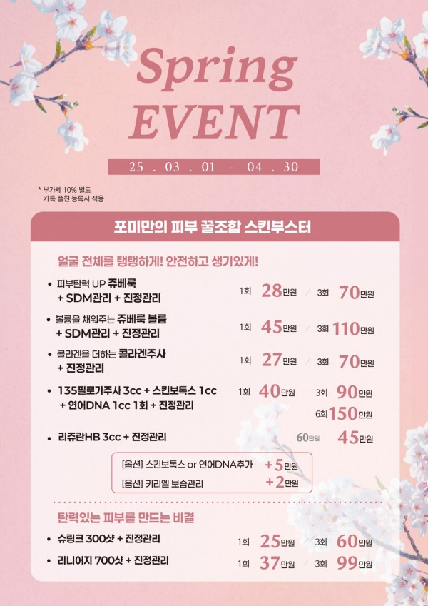 2025 Spring Event!! 페이지 정보 작성자 포미성형외과 작성일25-03-04 12:11 조회2,875회 관련링크 이전글 다음글 목록 답변 본문 2025 SPRING EVENT 입니다. 이전글 다음글 목록 답변